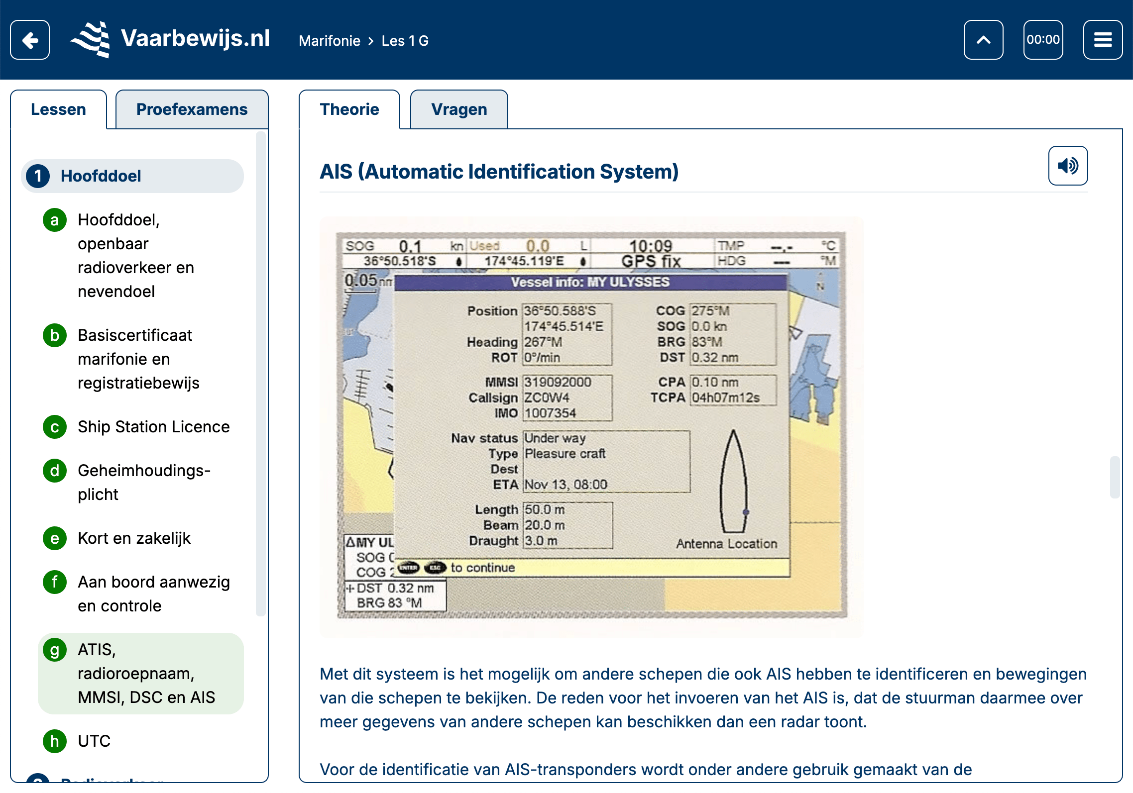 In de cursus komen alle facetten van marifonie aan bod, bijvoorbeeld AIS (Automatic Identification System).