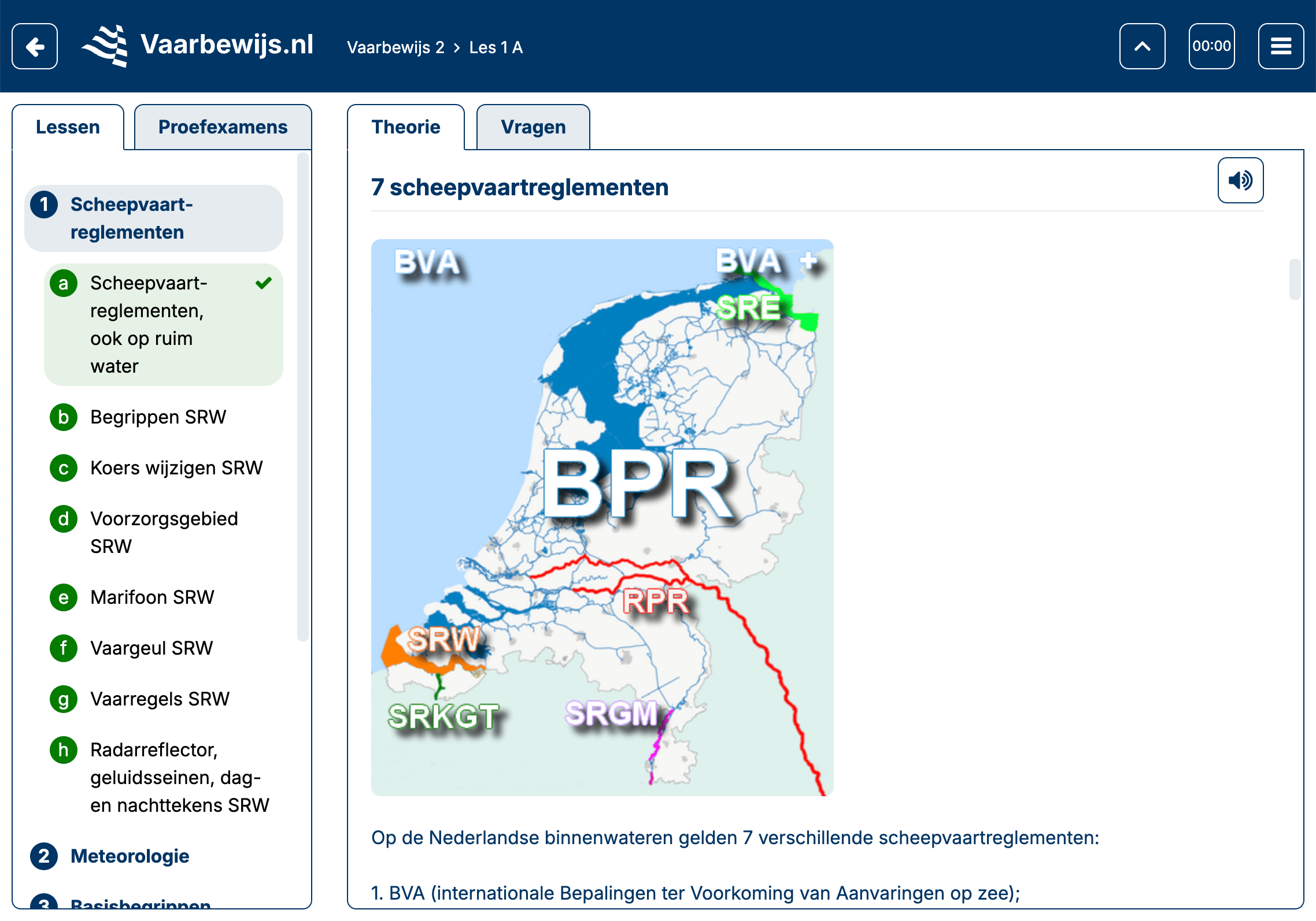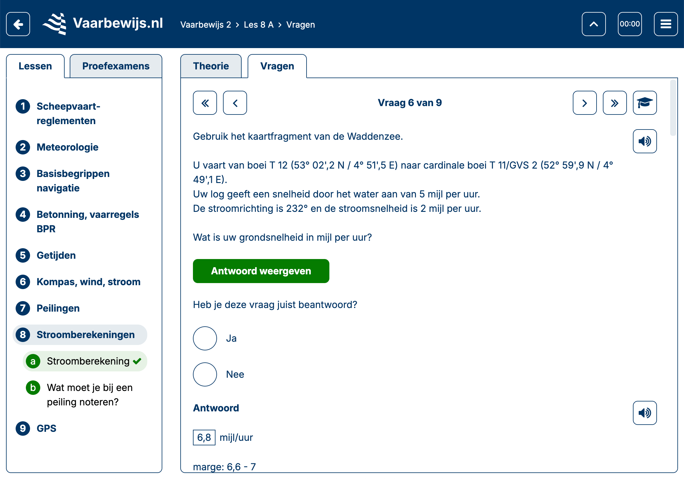 De theorie wordt helder uitgelegd met begrijpelijke tekst, duidelijke afbeeldingen en korte video's. Na afloop van iedere les test je jouw kennis met examenvragen in CBR-stijl. Nog meer oefenen? Maak dan proefexamens die bij jouw cursus zijn inbegrepen. Hierdoor weet je precies wat je te wachten staat en ga je met meer zekerheid het examen in. Je vaarbewijs halen wordt zo heel eenvoudig!