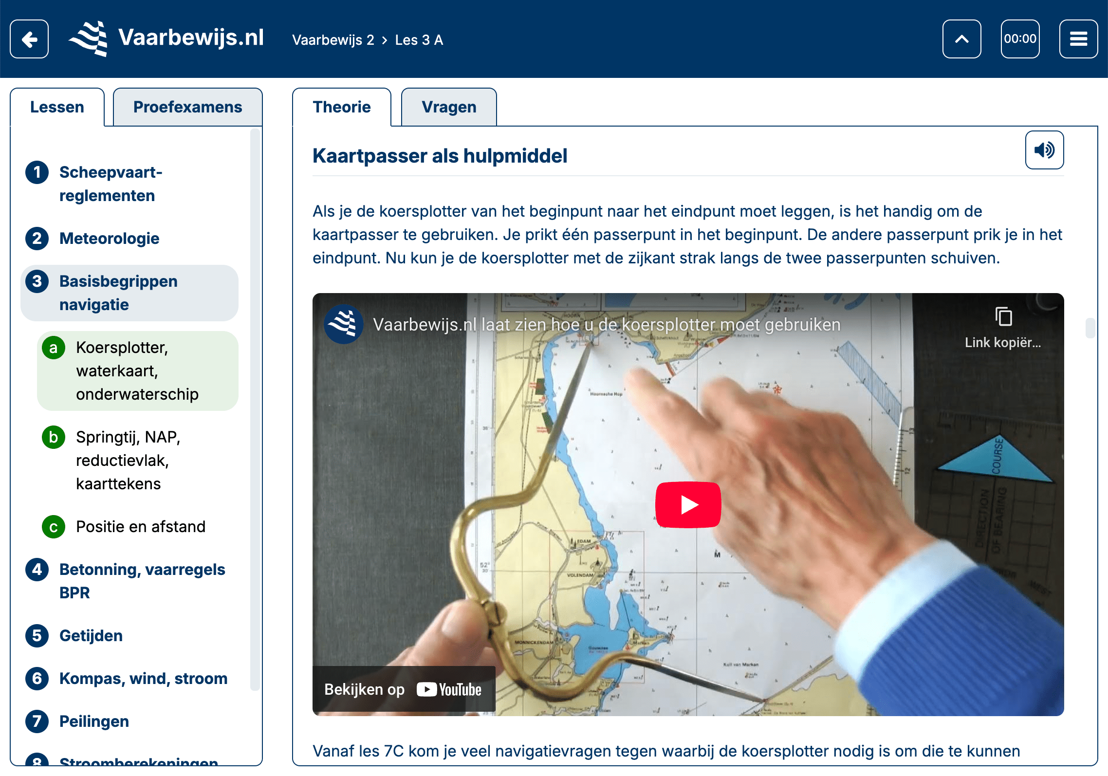 Je krijgt duidelijke uitleg van de theorie, waarbij veel afbeeldingen gebruikt worden, en die afgewisseld wordt met examenvragen. Je leert navigeren en hoe je de koersplotter en de kaartpasser moet gebruiken.