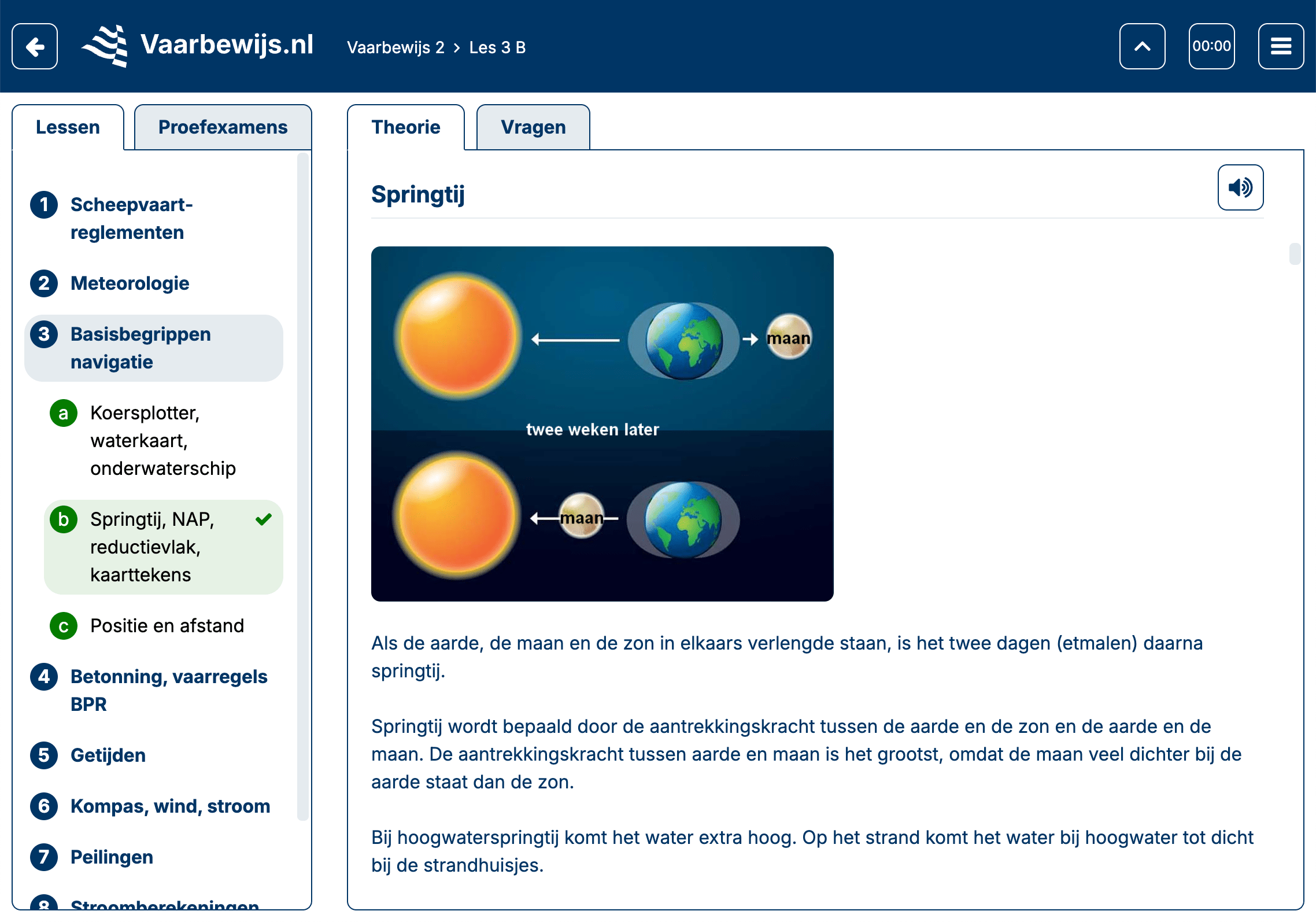 De webapp van Vaarbewijs.nl beschikt over een voorleesfunctie waarmee je de theorie en vragen kunt laten voorlezen. Deze voorleesfunctie is met name bedoeld voor cursisten met dyslexie of een visuele beperking. Dankzij de voorleesfunctie kunnen zij eenvoudiger kennis nemen van de theorie en vragen in onze online cursussen.